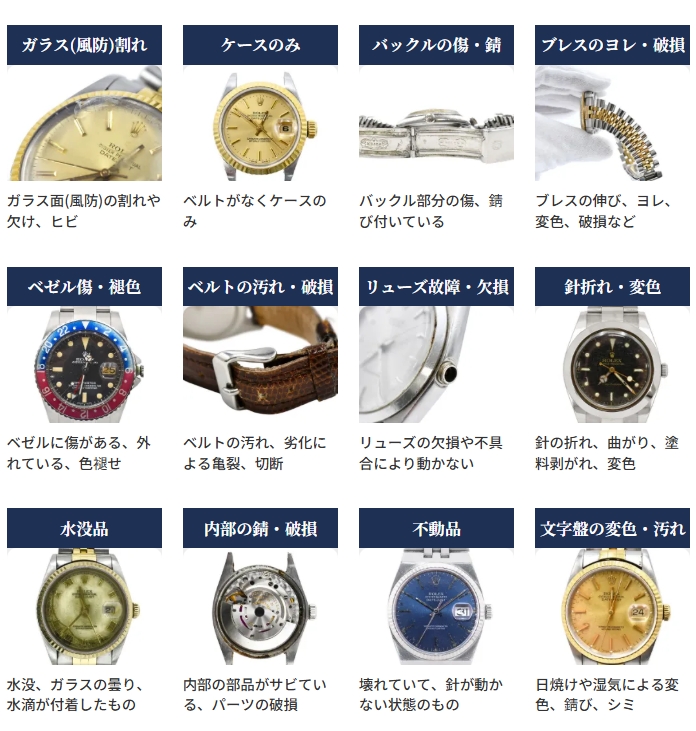 1点からでも出張査定が可能、以下のようにキズ・汚れ・動かない状態の悪いロレックスでも買取が可能なので、気軽に査定に申し込んでみてください。